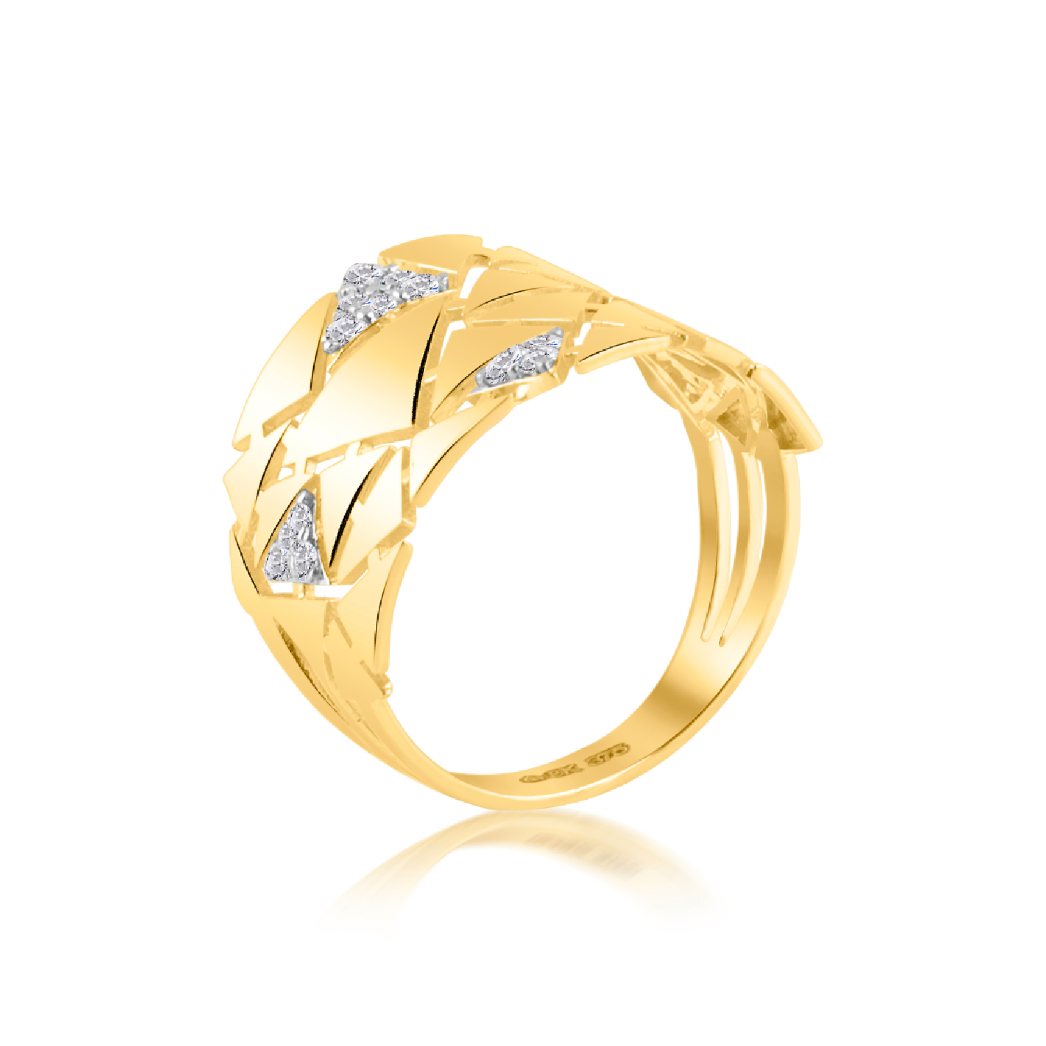 A celebration of symmetry and sparkle, the Prismé Ring features a bold geometric silhouette adorned with brilliant-cut diamonds. Inspired by the refraction of light through a prism, each facet tells a story of clarity, strength, and timeless elegance. Crafted in luminous gold, this piece is perfect for those who seek beauty in structure and meaning in design.